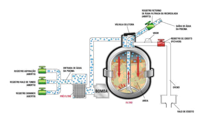 A posição Filtrar é tão importante quanto o tratamento químico e deve ser feita diariamente. A água passa pela areia do filtro, é filtrada e devolvida limpa para piscina.