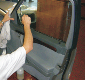 - O segredo de uma boa instalação de película é uma boa limpeza. A película não ficará bem instalada a menos que o vidro esteja muito limpo. A limpeza deve ser feita sempre com muito rigor. Você pode obter uma boa limpeza do vidro usando a solução de água e detergente, um raspador e um rodo de borracha preta. Esguiche a solução no vidro, aguarde um pouco para esperar a sujeira amolecer e retire a água com o rodo preto. Depois, esquiche uma vez mais a solução no vidro e retire a sujeira restante com o raspador. Dê uma atenção especial às bordas, pois é nelas que se acumula a grande maioria das partículas de sujeira.