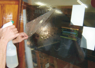 - Enquanto se retira a proteção, tome o cuidado de esguichar a solução no lado adesivo, para que, ao manusear a película, ela não cole em si mesma. A película é um produto frágil, e a falta de cuidado no manuseio pode levar à perda da peça. Após tirar totalmente a proteção, verifique se a película está bem umedecido. Depois de preparado a película, voltemos ao vidro. Molhe sua superfície interna com a solução de montagem, deixando-a escorrer.
