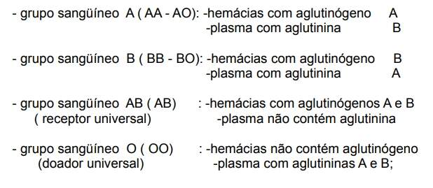 b) Provas sangüíneas (paternidade excluída). Constituem um método eficaz de exclusão de paternidade (sistema ABO, fatores MN, Rh, sistema HLA, haptoglobina, grupos P). Na herança dos fatores ABO (BERNSTEIN), são denominados fatores ABO os aglutinógenos das hemácias. Estes, em presença de aglutinina específica contida no plasma, se aglutinam (reação antígeno / anticorpo). A transmissão genética é condicionada por 3 genes alelos (A, B, O). Os dois primeiros são dominantes (expressam o fenótipo mesmo em dose simples), e o "O" é recessivo (expressa seu caráter somente se for em dose dupla, homozigoto).