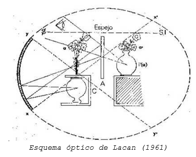 Esse pequeno truque feito com espelhos serve a Lacan para demonstrar o mecanismo que utilizamos para imaginar que possuímos algo como uma identidade coerente. No diagrama de Lacan, o espaço virtual por trás do espelho plano é onde o sujeito imagina que o seu eu existe como unidade. Esse espaço virtual contém também o olho do sujeito, mostrando que na relação do Imaginário com o Real tudo depende da situação do sujeito, seu lugar no mundo simbólico. O corpo real é como o vaso refletido no espelho, inacessível ao olhar. O sujeito, determinado pela ordem simbólica, nunca terá mais que uma apreensão imaginária do corpo (por isso, no esquema, ele vê a imagem do espelho côncavo pela sua reflexão no espelho plano).