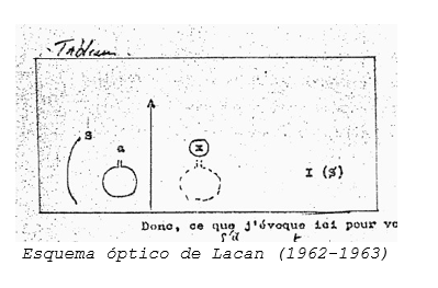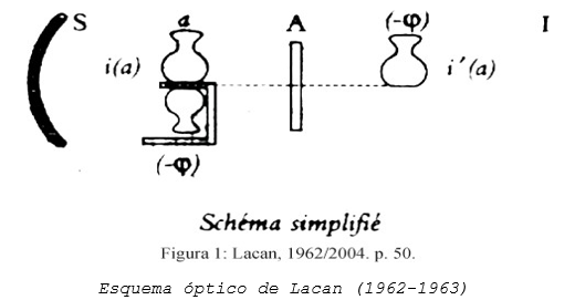 Sobre a imagem real dada pelo espelho côncavo - imagem primeira, narcísica - Lacan localiza o a, que simboliza as pulsões. Antes da imagem real, o que se tem é um corpo fragmentado. O continente pulsional pode relacionar-se com a imagem do corpo próprio, i’(a) por meio do espelho plano (que representa o Outro, A). Há um movimento de oscilação, uma reversibilidade da libido do corpo próprio para o objeto. A angústia, quando surge, é sinal da presença do objeto a. Se i’(a) é uma imagem refletida de nós mesmos, autenticada pelo Outro, ela não deixa de ser falaciosa, pois está ausente. Sua ausência, inclusive, é condição para que uma presença se dê em outro lugar, no lugar do - φ.