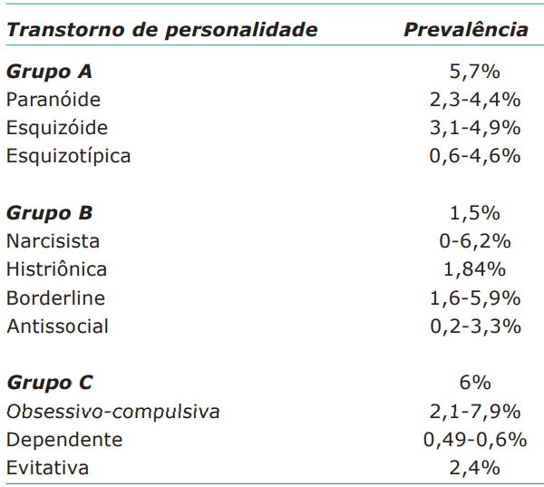 Estima-se que 9 a 15% dos adultos apresentem ao menos um transtorno da personalidade.3,13 Estudos epidemiológicos identificam que 4 a 12% da população apresenta um diagnóstico protocolar referente a este tipo de psicopatologia. Esta estimativa pode ser ainda maior quando consideradas manifestações menos incapacitantes destes quadros.