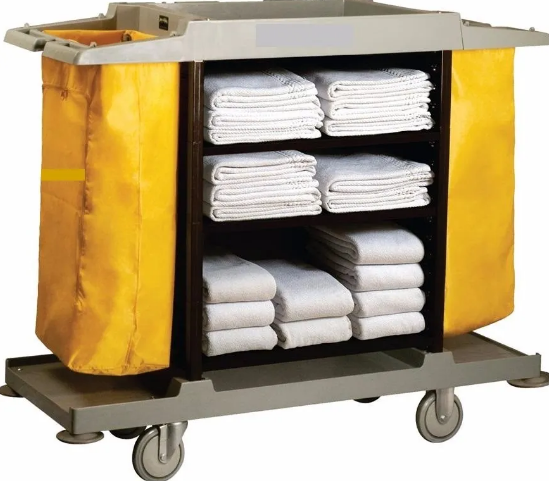 Estes carrinhos contêm: toalhas de banho e rosto, lençóis, sacos de plásticos grossos para colocar roupa suja, gavetas para kit de costura, sabonetes, luvas para lustrar sapato, papel higiênico, fitas para desinfecção, rol de roupas, conjunto de envelopes e papel para correspondência, blocos de comanda, copos, guardanapos, material de reposição de minibar, etc. Todo este material deve ser colocado no carrinho ordenadamente.
