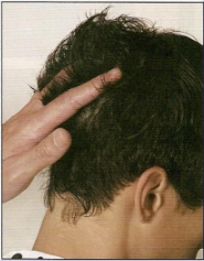 2.Fazer uma divisão em formato de ferradura a fim de separar o topo da cabeça.Para medir o tamanho,começar a risca a partir da metade da sobrancelha.