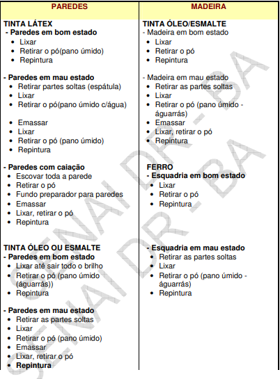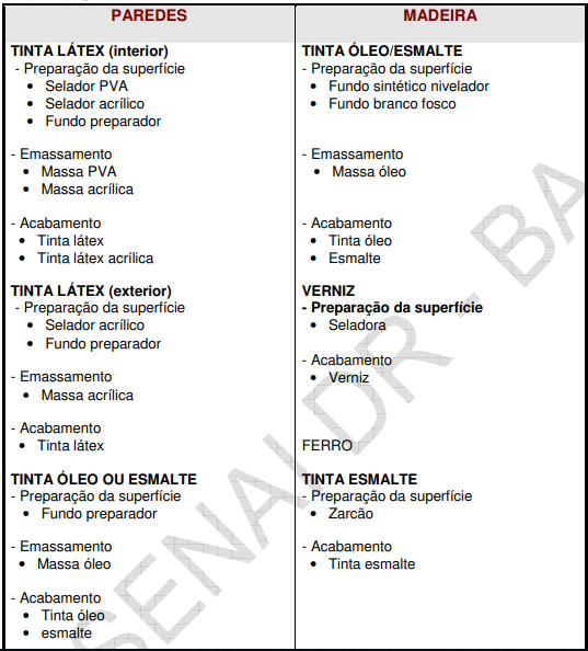 11.1 Tinta Alquídica Fosca:Apresenta acabamento fosco, altamente aveludada para paredes de reboco, madeira e peças metálicas. Aplica-se a pincel ou rolo de pintura, e quando necessário pode ser diluída com águarrás mineral com até 10%. Seca em 8 horas.