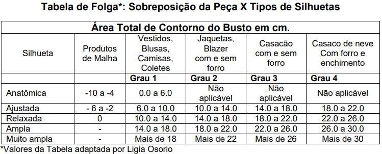 A construção de uma tabela de folga é fundamental para que haja consistência entre os diversos tipos de produto dentro de uma empresa. A tabela abaixo apresenta uma possibilidade em relação aos diferentes tipos de silhueta e o grau de sobreposição das peças entre os produtos de forma integrada.