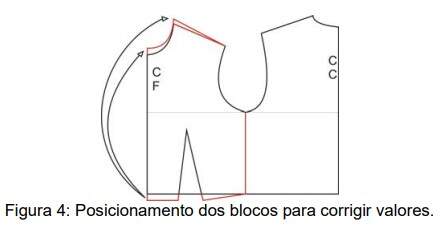 Na figura 4 os blocos são posicionados lado a lado de modo a corrigir os valores que ultrapassam a nova linha da cintura para a linha do decote e ombro.