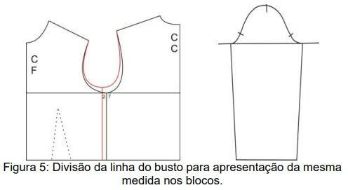 Na figura 5 a medida da linha do busto é dividida de modo que os blocos da frente e das costas apresentem a mesma medida. A linha lateral é elevada, para retomar a mesma medida de contorno da cava dos blocos anatômicos. O bloco da manga anatômica não será alterado.