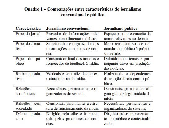 Pensando no jornalismo convencional, Eliasoph (2004) vai além e pergunta: é possível teorizar a imprensa sem teorizar o público? Resposta: não. E, adaptando a questão para o objeto deste trabalho: podemos teorizar uma proposta alternativa de produção jornalística, como jornalismo cívico, sem teorizar o público? É possível fazer isso sem cair na “armadilha” do determinismo dos meios sobre a sociedade? Segundo Eliasoph (2004) a única alternativa é analisar o papel desempenhado pelo sistema de comunicação em diferentes contextos, incluindo as características e demandas do público. Para isso seria necessário substituir o modelo corrente de análise do jornalismo, que é eminentemente institucionalista - como a apresentada no debate sobre jornalismo cívico – por abordagens mais culturalistas. A limitação das discussões sobre padrões sociais de expressão, diálogo público e procedimentos para o debate de temas de interesse coletivo é uma marca indissociável das propostas sobre o jornalismo cívico, sejam elas de cunho teórico ou descritivas de experiências empíricas. Com isso, há uma desconsideração a respeito do papel constitutivo das relações entre produtores, fontes e público nos processos de comunicação social através do jornalismo (GADINI, 2007). Assim, analisar o papel da mídia e propor modelos alternativos de produção das notícias visando determinados efeitos sem considerar as características próprias da interação cotidiana do público tem pouca validade por desconsiderar um dos atores mais relevantes do processo, que é o cidadão e seus padrões de cidadania. Qualquer proposta que vise melhorar a qualidade das notícias para a comunidade precisa considerar, em primeiro lugar, as características dos cidadãos e não as instituições jornalísticas. Porém, não é o que se percebe na literatura corrente sobre formas alternativas de jornalismo de massa institucionalmente constituído. De qualquer maneira, ainda que não se considerem as demandas reais do público, os principais avanços no debate sobre o jornalismo público foram no sentido de qualificá-lo como oposição ao jornalismo convencional. O quadro a seguir apresenta uma comparação entre as características distintivas de cada modelo.