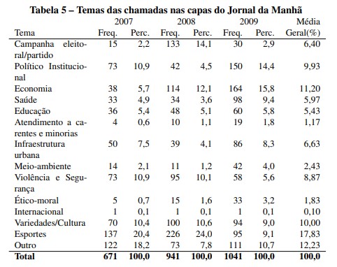 Como se pode perceber na tabela 5, o tema que mais apareceu proporcionalmente nas primeiras páginas do JM na média dos períodos dos três últimos foi Esportes, com 17,8%. Em seguida vem Economia (11,2% de média) e Variedades/cultura (10% de média). Todos os demais temas ficam abaixo de 10% de aparição nas capas. Existem algumas variações internas importantes.