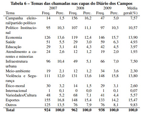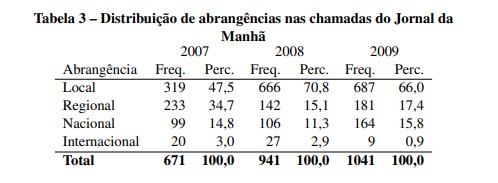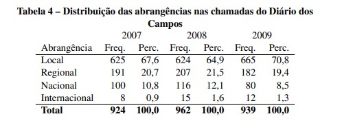 O percentual de chamadas com abrangência internacional permaneceu em queda ao longo dos três anos e em percentuais muito reduzidos, entre 3% em 2009 para menos de 1% no mesmo período de 2009. As informações permitem concluir que o crescimento da abrangência local na primeira página foi resultado da redução na abrangência regional, sem nenhuma diferença significativa na quantidade de chamadas nacionais ao longo do período. Para dar continuidade à análise comparativa, a tabela 4 a seguir mostra as abrangências das chamadas de primeira página do Diário dos Campos no mesmo período.