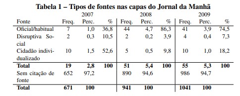 Como existem informações disponíveis para os meses de agosto a outubro dos últimos três anos, é possível também comparar possíveis mudanças ao longo do tempo nos dois periódicos. A tabela 1 a seguir apresenta os resultados da presença de fontes por ano do JM. É possível verificar que o número de chamadas que citam fontes aumentou. De um percentual de 2,8% em 2007 vai para 5,4% em 2008 e praticamente se mantém com 5,3% do total em 2009. Em relação aos tipos de fontes que mais aparecem, há uma queda no espaço oferecido ao cidadão individualizado e um crescimento de fontes oficiais ao longo do tempo. Em 2007, 52,6% das fontes citadas nas capas do jornal eram cidadãos individualizados, passando para 9,8% no ano eleitoral de 2008 e subindo para 18,2% em 2009. No entanto, as fontes oficiais, que representavam 36,8% do total de fontes nas chamadas de primeira página em 2007, aumentaram para 86,3% em 2008 e tiveram uma pequena queda em 2009, com 74,5% do total. É possível que a campanha eleitoral de 2008 tenha influenciado na escolha das fontes utilizadas nas chamadas de notícia no Jornal da Manhã, pois nesse ano a presença de fontes oficiais cresceu 49,5 pontos percentuais em relação ao anterior. De qualquer maneira, houve uma manutenção da predominância desse tipo de fonte em 2009, ficando em 74,5% do total. Ou seja, apesar de ter crescido o percentual de chamadas de capa com citação de fontes nos últimos três anos do JM, isso não necessariamente aumentou a pluralidade de “vozes” no espaço de maior destaque do periódico. Esse crescimento se deu em paralelo à ampliação das fontes oficiais no jornal, o que indica o caminho contrário ao jornalismo cívico.