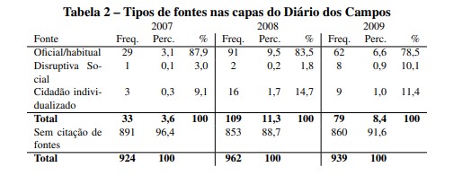 Analisar apenas o comportamento do JM não é suficiente para identificar se o periódico se aproxima ou não do modelo de Jornalismo Público. Para isso, a tabela 2 mostra a distribuição dos tipos de fontes citadas pelo Diário dos Campos no mesmo período. Verifica-se que em relação ao Jornal da Manhã, o percentual de fontes citadas fica muito próximo em 2007, porém, cresce bastante em 2008, o que também pode ser efeito da campanha eleitoral. Quanto ao tipo de fonte, há um predomínio de fontes oficiais nos três anos. O curioso é que o JM, que no início do projeto de jornalismo público, apresentava uma presença maior de “cidadão individualizado” na primeira página, a partir de 2008 aproxima-se bastante do comportamento do DC no que diz respeito à predominância de fontes oficiais em suas capas.