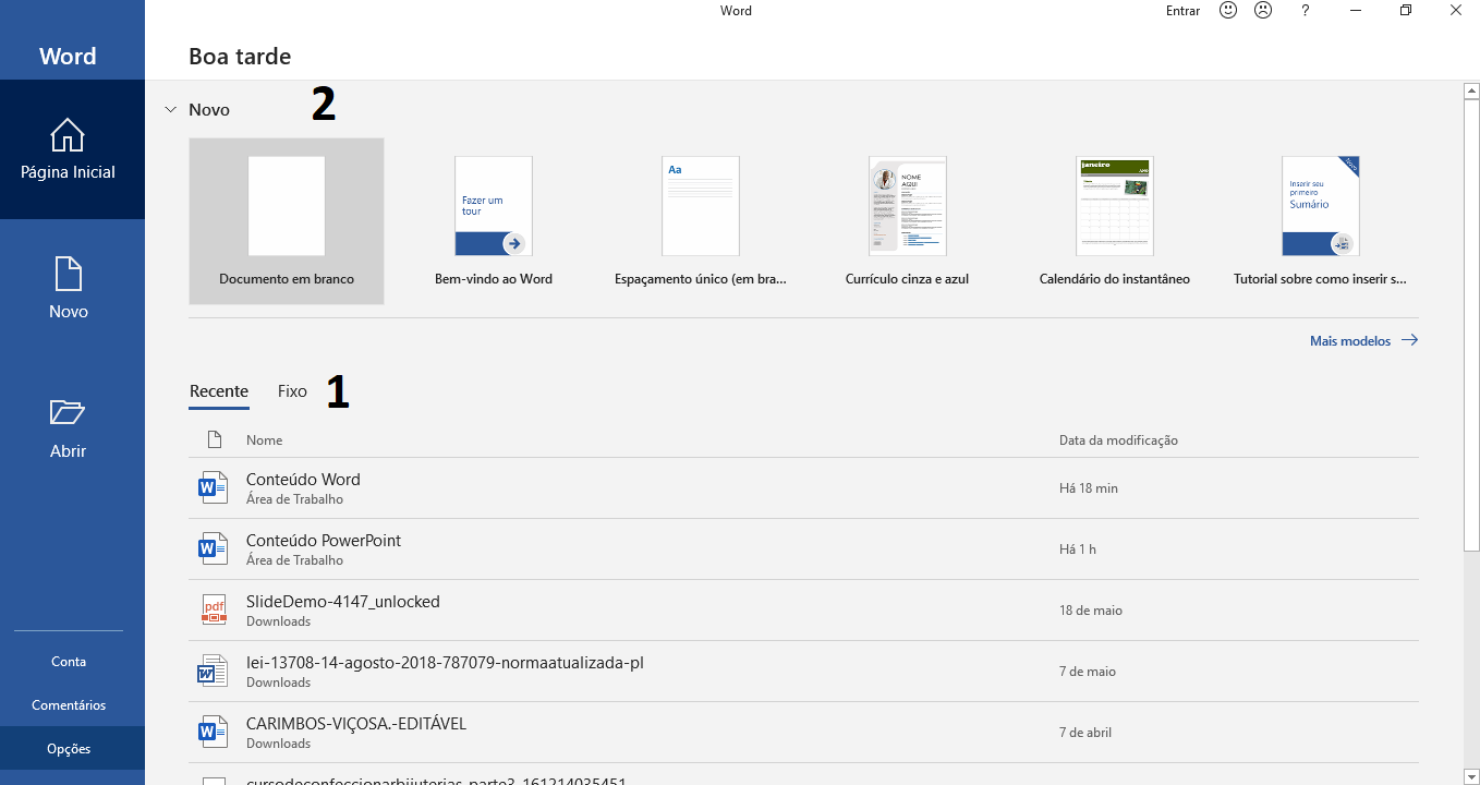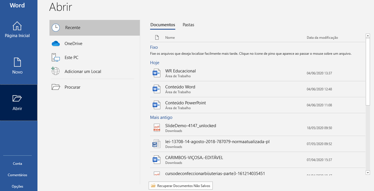 A primeira informação apresentada são os documentos recentes, ou seja, aqueles que você utilizou recentemente. Isso tem por objetivo facilitar seu trabalho de busca.Se o arquivo desejado estiver na lista, basta clicar nele. Para retirar um documento dessa lista, basta clicar com o botão direito sobre o documento e escolher Remover da lista.