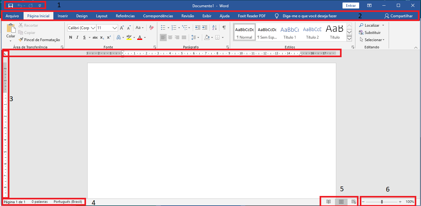 A barra de status engloba também os itens 5 e 6, mas estou dividindo por uma questão didática. Aqui temos informações sobre nosso arquivo, a quantidade de páginas e palavras, bem como o idioma utilizado.