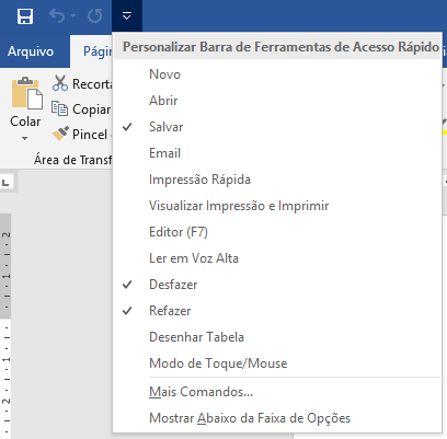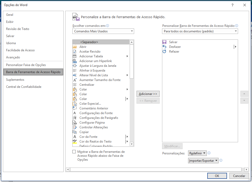 Nessa área temos disponíveis ícones com alguns comandos mais utilizados, como salvar, desfazer etc. Para customizar essa área, cliquem em Arquivo e depois escolha Opções. Na janela que se abre, escolha Barra de Ferramenta de Acesso Rápido. Aí é só escolher o comando e Adicionar (ou remover, conforme o caso).