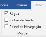 Nas réguas podemos observar / criar algumas marcações para facilitar nosso trabalho. É na régua que podemos também verificar posicionamentos e anotar medidas. Para exibir / ocultar as réguas, utilize a guia Exibição e marque o comando Régua no grupo Mostrar: