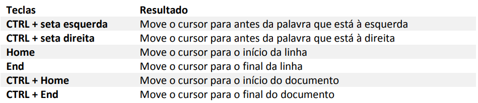 É possível transportar-se de um lugar para o outro simplesmente clicando com o botão direito do mouse onde queremos colocar o cursor, mas existem teclas de atalho que poderão ser muito úteis no processo de criação de um documento. Os mais utilizados são: