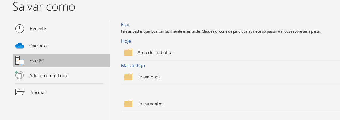 No lado direito temos as últimas pastas que acessamos, como sugestão e tendo como objetivo melhorar nossa produtividade. Caso a pasta desejada não apareça, clique no botão Procurar para poder navegar até a pasta desejada.
