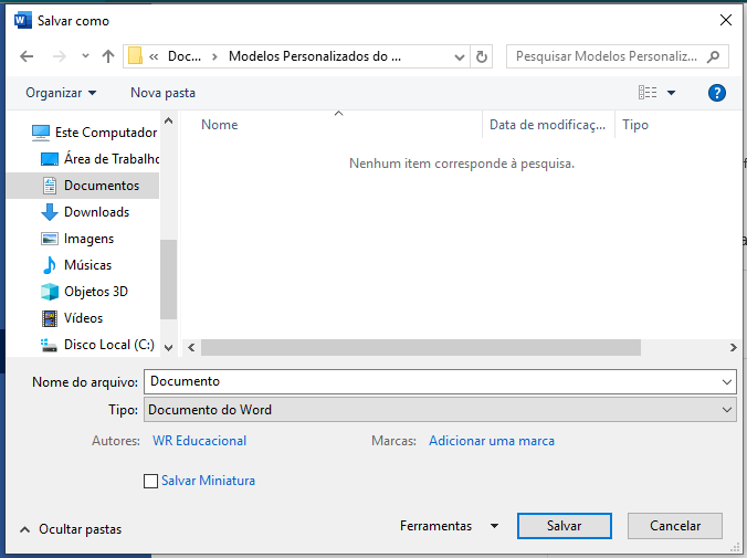 Note que a tela se apresenta com o título Salvar Como. Como estamos salvando o documento pela primeira vez, é essa tela que o MS Word Utiliza. Se você está com um documento que já foi salvo mas pretende salvá-lo em outro lugar ou com outro nome, utilize Arquivo >> Salvar Como. Você será remetido a essa mesma tela.