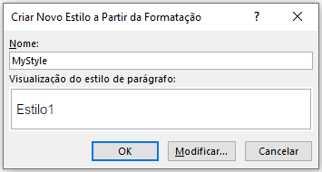 O primeiro passo é definirmos o nome para nosso estilo. É importante lembrar que não poderemos ter dois estilos com o mesmo nome e não é conveniente (pelo menos agora, com nosso nível de conhecimento do MS Word, alterar os estilos presentes). Portanto, escolha um nome que não faça parte da lista existente de estilos definidos por padrão. Após isso, clique em Modificar...