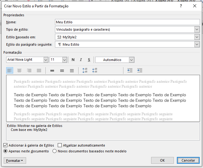 Esse estilo, por padrão, será criado somente nesse documento, porém, se este documento fosse um modelo, o estilo poderia ficar no modelo e estar presente em todos os documentos criados a partir dele. Veremos a criação de modelos em curso específico.