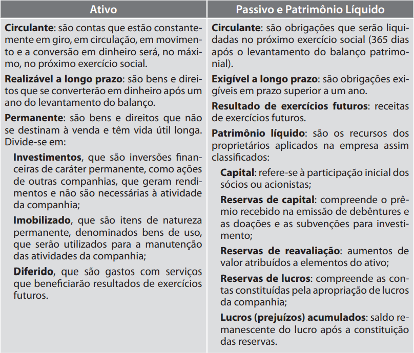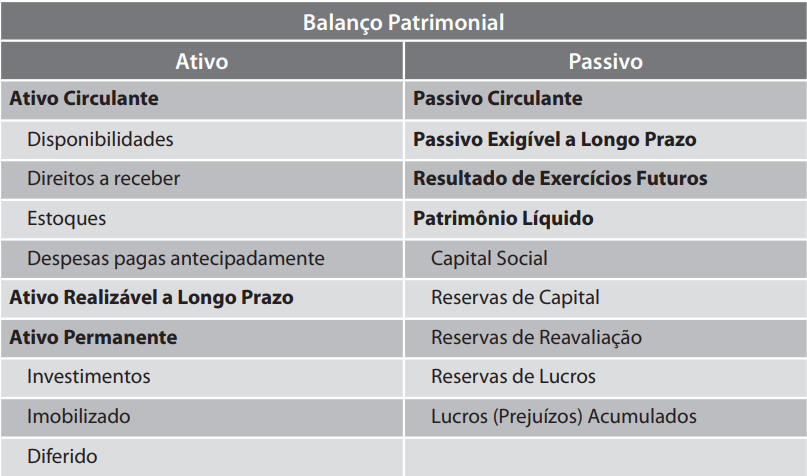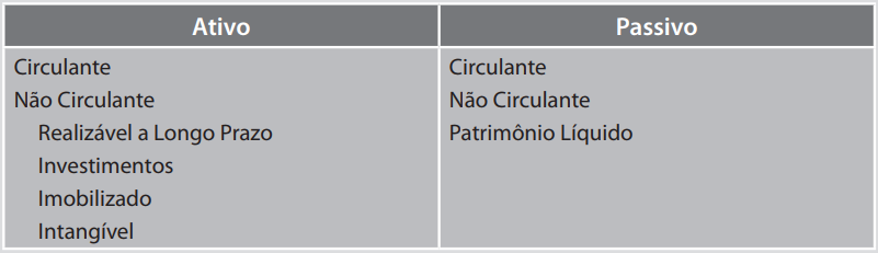 De acordo com os artigos 178 e 179 da Lei 6.404/76 (denominada Lei das Sociedades Anônimas), as contas serão classificadas em grupos, segundo os elementos do patrimônio que representam, de acordo com o que pode ser visto no quadro 1.