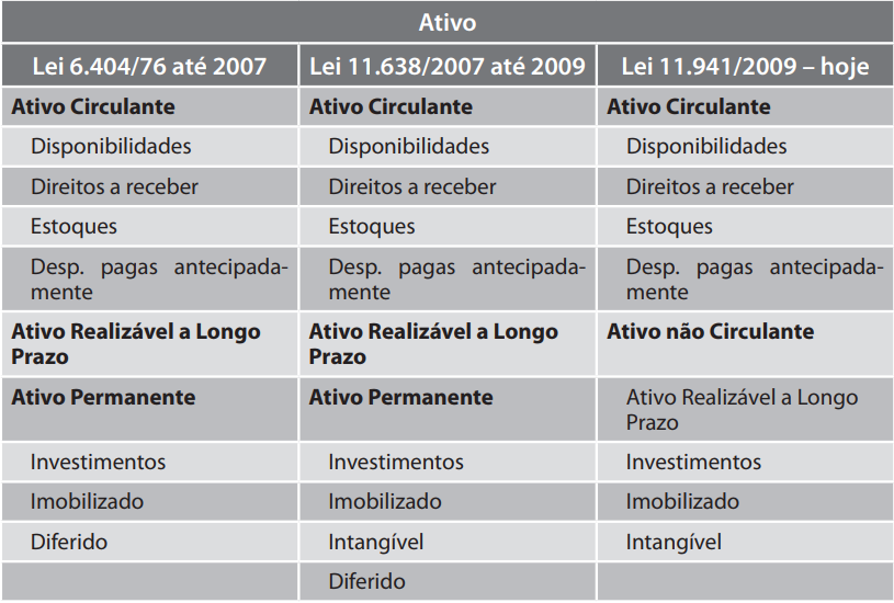 A estrutura do ativo sofreu diversas modificações e, atualmente, é composta dos seguintes grupos de contas: ativo circulante e ativo não circulante, e este subdividido em realizável a longo prazo, investimentos, imobilizado e em intangível.