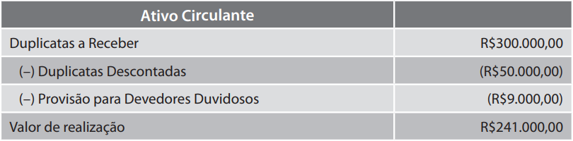 Suponha que a Cia. Beta, na data do balanço patrimonial, possui um saldo de duplicatas a receber no valor de R$300.000,00 e que, objeto de operação de desconto, tenha negociado com o Banco Ômega duplicatas no valor de R$50.000,00 e, ainda, que tenha previsto que R$9.000,00 dessas duplicatas tenham sido aceitas por clientes duvidosos. Essas contas serão demonstradas no balanço patrimonial na forma apresentada no quadro 5.