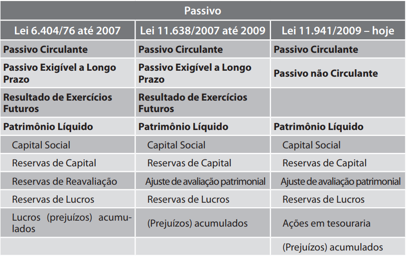 Quadro 4 – Estrutura do passivo e do patrimônio líquido conforme as Leis 6.404/76, 11.638/2007 e 11.941/2009: