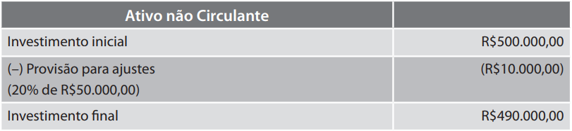 Todos os investimentos permanentes devem ser avaliados pelo método da equivalência patrimonial. Dessa forma, se houver um prejuízo na empresa controlada ou coligada, ele terá uma perda no valor dos investimentos da investidora. Suponha que a empresa investidora participe com R$500.000,00, e que esse investimento represente 20% do capital da empresa investida, e que esta, no atual período, tenha apurado um prejuízo de R$50.000,00. A investidora terá que efetuar uma provisão para ajuste dos investimentos proporcionalmente à equivalência patrimonial. Dessa maneira, o ajuste será o correspondente a 20% de R$50.000,00, ou seja, R$10.000,00. Graficamente, o ativo não circulante será demonstrado de acordo com o quadro 6.