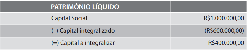 Quando se constitui uma sociedade, os sócios subscrevem o capital que deverá ser entregue à sociedade, porém, o capital subscrito pode ser integralizado em parcelas de acordo com cronogramas avançados. Subscrição é o ato jurídico formal pelo qual o acionista assume a obrigação de transferir bens ou direitos para o patrimônio da entidade. Integralização corresponde à transferência de recursos do patrimônio particular para o patrimônio da entidade. A parcela que foi integralizada denomina-se capital realizado e a parcela não integralizada denomina-se capital a integralizar. Suponha que o capital subscrito pelos sócios da Cia. Alfa tenha sido de R$1.000.000,00, sendo que eles entregaram à sociedade recém-constituída somente R$600.000,00 e que o restante seria entregue futuramente de acordo com cronograma financeiro constante da ata de instalação. Graficamente, o patrimônio líquido ficará de acordo com o quadro 8.