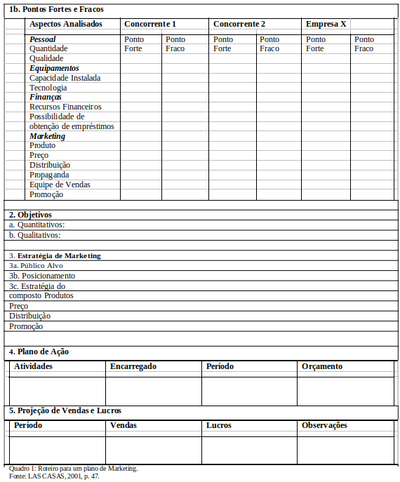 Las Casas (2001) apresenta um roteiro simplificado para um plano de marketing: