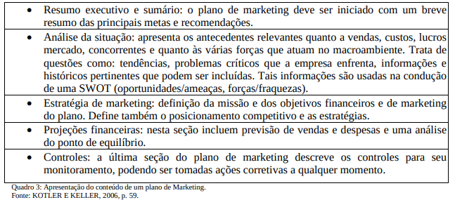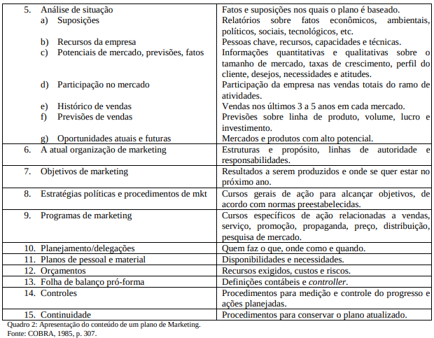 O plano de marketing baseado em Cobra (1985, p. 307), apresenta a seguinte configuração: