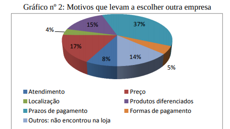 Os motivos de comprar em outra empresa do ramo estão destacados no gráfico nº 2. São eles: prazos de pagamento (37%), preço (17%), produtos diferenciados (15%), produtos não encontrados na empresa (14%). Localização, atendimento e formas de pagamento representam menos do que 10% cada quesito.