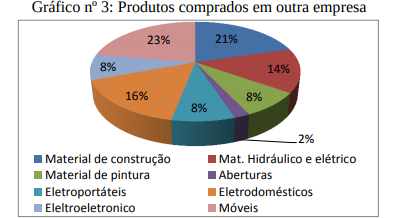 É necessário ainda, estar atento a que produtos os clientes estão buscando na concorrência. Os clientes buscaram (conforme gráfico nº 3) móveis (23%), material de construção (21%), eletrodomésticos (16%), material hidráulico e elétrico (14%).
