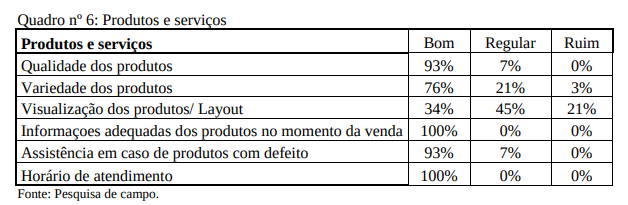 O quadro nº 6 demonstra quesitos a respeito de produtos e serviços. Surgiu uma crítica por parte dos clientes com relação à variedade dos produtos, e, principalmente ao layout. Em função do pouco espaço para estoque, ocorreu o acúmulo de produtos nas prateleiras, causando uma aparência de desorganização. Além de gerar poluição visual na empresa, esta, não expoe os produtos, adequadamente, para a venda.