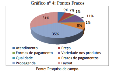 Os ponto fracos da empresa que tiveram destaque foram: propaganda (35%), layout (31%) e variedade dos produtos (11%). O layout e a variedade dos produtos também foram apontados no quadro nº 6, quando mais da metade dos respondentes julgaram como regular e ruim o layout, e, ¼ destes, julgaram regular ou ruim a variedade dos produtos. Estes se confirmaram como ponto fraco da empresa no gráfico 4.