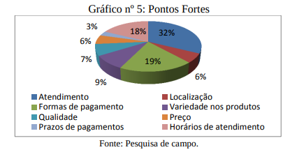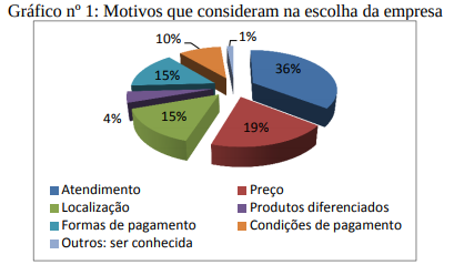 O gráfico nº 1 representa os motivos decisivos elencados pelos respondentes para escolher a empresa. O principal foi o atendimento (36%). Seguido por preço (19%), localização (15%) e formas de pagamento (15%). Os demais representam percentual inferior a 10% cada item. Percebe-se a importância do bom atendimento. Os proprietários da empresa mencionaram que, um dos diferenciais da empresa é o contato destes com os clientes, evitando burocracias e retornos demorados para solução de problemas. Por outro lado, estes julgam deficitário o atendimento do funcionário para com o cliente. Este deve ser um ponto melhorado por parte da empresa, a fim de estreitar os laços com os clientes e prestar um atendimento personalizado. Busca-se subsídio em Cobra (1991, p. 100), em que o autor afirma que uma empresa pode “diferenciar seu negócio de diversas maneiras, desde a variedade de produtos oferecidos, até a configuração do próprio produto [...], pelo preço mais competitivo, ou pelo serviço personalizado ao cliente”.