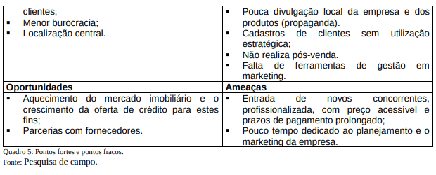 No quadro 5 constam os pontos fracos, fortes, ameaças e oportunidades, na visão dos proprietários.