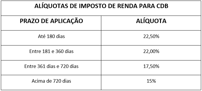Alguns títulos de renda fixa que oferecem aos investidores a isenção de imposto de renda sobre seus rendimentos, os CDBs, por sua vez, têm não são contemplados com isso e sua remuneração é tributada junto à Receita Federal. O valor do imposto varia de acordo com o tempo de aplicação, considerando-se a data de resgate como determinante para a alíquota aplicável.
