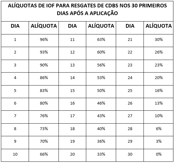 Além do imposto de renda, os investidores estão sujeitos ao pagamento do IOF, caso optem por resgatar o valor investido nos primeiros 30 dias a contar da data da aplicação. O IOF tem alíquotas decrescentes, ou seja, alíquotas menores, quanto maior o prazo até o resgate dentro dos 30 dias.