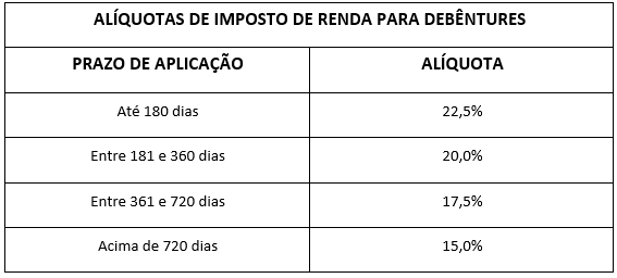 A taxa de juros informada na escritura de emissão é uma taxa bruta, e o rendimento líquido para o investidor deve ser calculado após a dedução do imposto de renda, através da alíquota relativa ao prazo de aplicação contado desde o seu início.
