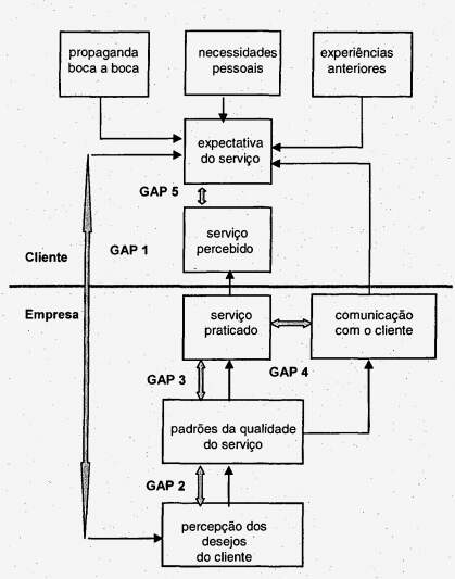 Baseados nas cinco dimensões-padrão de atributos de qualidade, o modelo denominado SERVQUAL ou modelo de "gaps" de serviços, corno em geral conhecido, é uma tentativa de Parasuraman, Zeithaml e Berry · (1985), de estudar a percepção dos consumidores sobre a qualidade de serviços Para eles além da "qualidade percebida", que se dá por meio das dimensões técnica e funcional, há o aspecto da "qualidade esperada", que é função de quatro grupos básicos de fatores: comunicação com o mercado, imagem corporativa e da loja, propaganda boca-a-boca e necessidades do consumidor, além, obviamente, das experiências anteriores do cliente com o serviço.