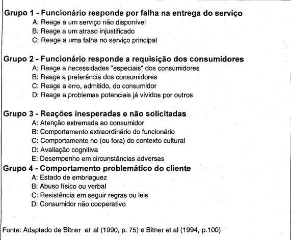 A classificação dos incidentes teve como ponto de partida a codificação da pesquisa do estudo anterior (Bitner, Bomm e Tetreault, 1990). Apenas 11 % dos incidentes não puderam ser categorizados em nenhum dos três grupos, tendo sido criada uma quarta categoria, o Grupo 4, que pode ser visto na figura 2.1 apresentada anteriormente. Apenas 3 incidentes, do total de 86, classificados nessa categoria puderam ser considerados satisfatórios, demonstrando que os funcionários tiveram problemas para lidar com as situações evidenciadas.