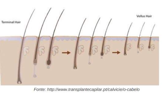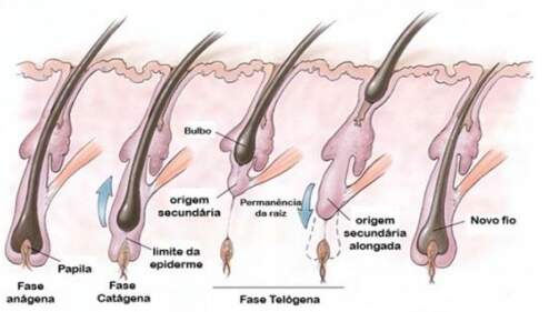 Fases - ETAPAS DA EVOLUÇÃO DO PELO Os pelos, atingindo um determinado comprimento, cessam de crescer, entretanto se forem cortados, tornarão a crescer com uma rapidez que varia segundo a região do corpo, e é sempre maior nos jovens e nos períodos quentes do ano. Os pelos são formações transitórias, porque a intervalos mais ou menos longos se renovam; assim, por exemplo, os cabelos, renovam-se de dois a cinco anos, os cílios a cada três a cinco meses, etc.... O processo inicia-se com um espessamento das camadas externas da bainha externa (também chamada de bainha dérmica) do folículo piloso, enquanto a papila do pelo vai evoluindo, desaparecem as divisões mitóticas (crescimento celular) nas células da matriz do pelo; as células do bulbo do pelo se corneificam, e este perde a formação côncava que possuía na base (pelo em forma de clava); e a bainha da raiz é reabsorvida.