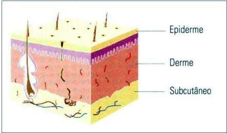 A pele apresenta duas camadas, a derme e a epiderme. E logo abaixo da derme, encontramos a tela subcutânea, ou hipoderme, que é uma camada de tecido conjuntivo frouxo. Além disso, há vários órgãos anexos como glândulas sudoríparas e sebáceas, folículos pilosos, etc.