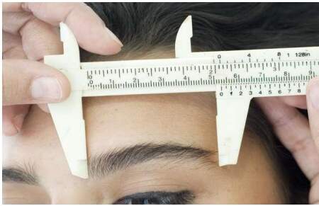 Passo 2 – Medir o espaço que existe entre os dois olhos. Se sua média do olho for maior que a medida entre os dois olhos, você tem olhos juntos. Se sua média do olho for menor ou igual a medida entre os dois olhos, você tem olhos separados. Para encontrar o início da sobrancelha, o paquímetro deve estar encostado na aba do nariz junto com o canto interno do olho, fazendo assim uma linha reta. Depois, para marcar o final da sobrancelha, deve-se apenas arrastar o paquímetro para o canto externo do olho. O ponto mais alto da sobrancelha é encontrado com o paquímetro localizado no fim da íris.