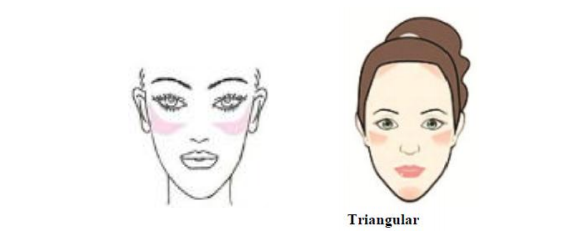 A testa é muito mais larga que o maxilar. Assemelha-se a um triângulo invertido. Para equilibrar é preciso: aplicar uma base dois tons mais escura nas laterais da testa; o blush deve ser aplicado um dedo além da linha do sorriso no meio das faces em direção ao meio da orelha.